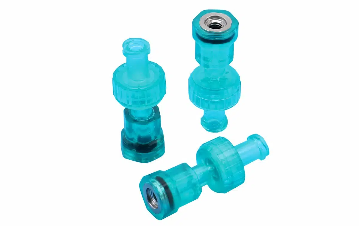 Auxiliary Water Channel Connector for Olympus style threaded post. Threaded end has metal insert to resist cross-threading and stripping threads. Lure lock connection works with irrigation tubing, IV tubing and syringes.