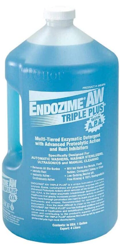 ENDOZIME AW TRIPLE PLUS is a unique formulation of protease, amylase, lipase, carbohydrase and proprietary enzymes with A.P.A. (Advanced Proteolytic Action) which removes all bio-burden and inhibits rust. A.P.A. is the latest enzymatic breakthrough developed by Ruhof Healthcare that greatly increases protein enzyme activity to provide a faster more thorough penetration into hard-to-reach places on surgical instruments and scopes.